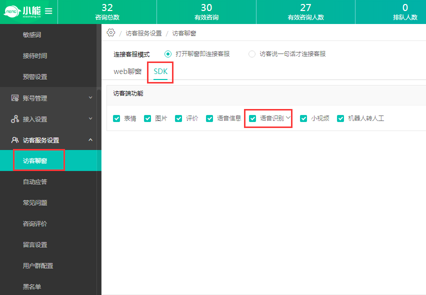 小能sdk有语音识别功能,即可以将语音转为文字发送出去;该功能的开关可以在客服端的设置—>访客客服设置—>访客聊窗—>SDK—>访客端功能进行开关控制,如果您不需要该功能可以勾掉该选项。